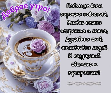 Красивая открытка с пожеланием доброго утра. На изображении представлена изысканная чашка кофе или чая с нежной фиолетовой розой внутри, дополненная пышным букетом лавандовых и сиреневых роз. Композиция выполнена в нежных пастельных тонах с золотистыми элементами сервировки. Справа расположен вдохновляющий текст на русском языке с пожеланиями хороших новостей, искренних улыбок, душевных слов и прекрасных ощущений. Идеально подходит для отправки в мессенджерах и социальных сетях для создания праздничного утреннего настроения.