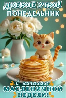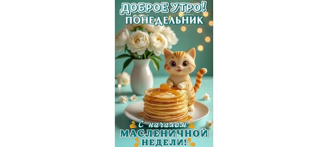 Открытка "ДОБРОЕ УТРО! ПОНЕДЕЛЬНИК. С НАЧАЛОМ МАСЛЕНИЧНОЙ НЕДЕЛИ!"
