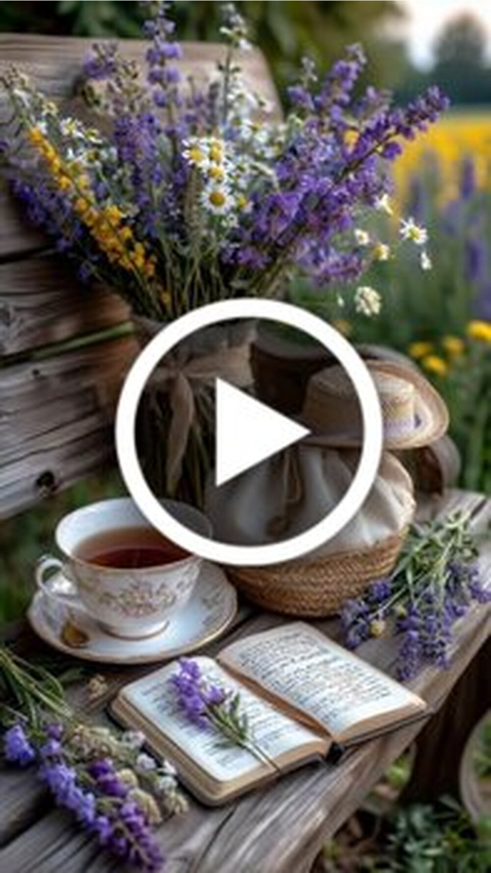 Атмосферное видео для вдохновения и позитивного настроя на весь день. На деревянном столе в саду разложена эстетичная композиция из букета полевых цветов лавандового оттенка, открытой книги и чашки горячего чая. Рядом лежит соломенная шляпа, создавая ощущение уютного летнего утра. Поверх кадра наложен мотивирующий текст о том, что солнце поднимается и начинается новый прекрасный день. Видео призывает открыться удаче, смело следовать за своей мечтой и верить в то, что все обязательно будет хорошо. Идеально подходит для утренних пожеланий и создания спокойного настроения.