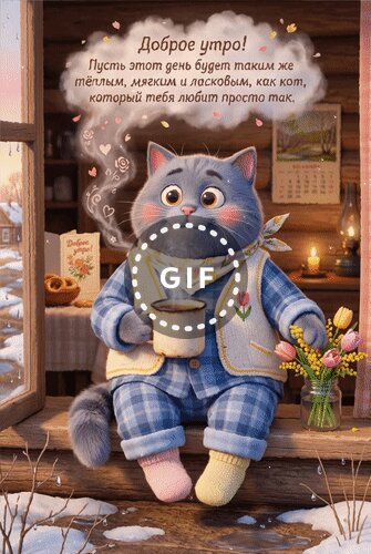 Анимированная открытка "Доброе утро! Пусть этот день будет таким же тёплым, мягким и ласковым, как кот, который тебя любит."