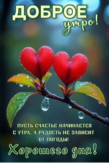 Красочное и эмоциональное открытое изображение для пожелания доброго утра. На картинке изображены два красных сердца, напоминающих лепестки или листья, покрытые капельками росы, которые растут на ветке с зелеными листьями. Фон размытый, в мягких природных тонах. На картинке на русском языке размещен вдохновляющий текст: «ДОБРОЕ утро! Пусть счастье начинается с утра, а радость не зависит от погоды! Хорошего дня!». Идеально подходит для отправки в мессенджерах (WhatsApp, Viber) и социальных сетях в качестве утреннего приветствия для друзей, близких и любимых.