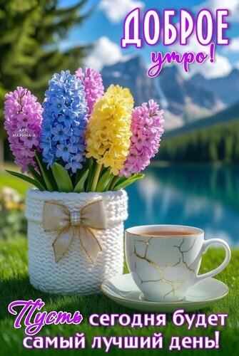 Красочное поздравительное изображение к доброму утру. На переднем плане — пышный букет разноцветных гиацинтов (синих, желтых, розовых) в белом вязаном горшочке с изящным бантом. Рядом стоит чашка кофе или чая с золотистым узором на белой чашке и блюдце. Фон представляет собой живописный пейзаж: спокойное озеро, хвойный лес и величественные заснеженные горы под ясным небом. На картинке расположены вдохновляющие надписи на русском языке: «Доброе утро!» и «Пусть сегодня будет самый лучший день!». Идеально подходит для отправки в мессенджерах и социальных сетях для создания праздничного настроения.