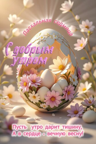 Красивая поздравительная открытка к Пасхе с изображением декоративного яйца, наполненного нежными розовыми и белыми цветами и маленькими пасхальными яйцами. На картинке присутствует надпись на русском языке: «Пасхальная седмица» и «С добрым утром», а также трогательное пожелание: «Пусть утро дарит тишину, А в сердце - вечную весну!». Светлая, солнечная и весенняя композиция, идеально подходящая для праздничных поздравлений в социальных сетях и мессенджерах.