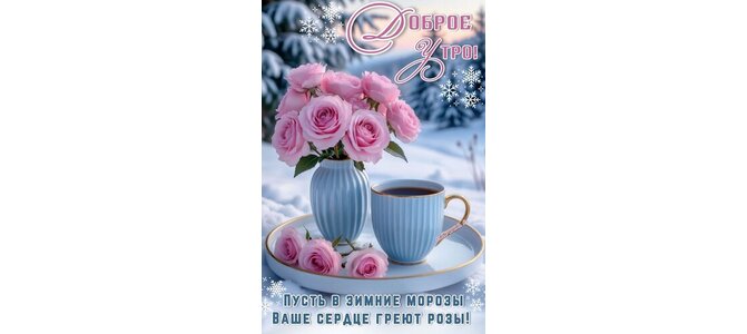 Открытка "ДОБРОЕ УТРО! ПУСТЬ В ЗИМНИЕ МОРОЗЫ ВАШЕ СЕРДЦЕ ГРЕЮТ РОЗЫ!"