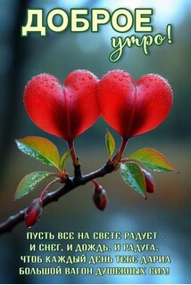 Красивая поздравительная открытка с пожеланием доброго утра. На изображении представлены два ярко-красных сердца, напоминающих лепестки или плоды, покрытые капельками росы, которые растут на ветке с зелеными листьями. На картинке нанесен текст на русском языке: сверху крупными буквами «ДОБРОЕ утро!», а снизу вдохновляющая цитата: «Пусть все на свете радует - и снег, и дождь, и радуга, чтоб каждый день тебе дарил большой вагон душевных сил!». Идеально подходит для отправки в мессенджерах и социальных сетях для поднятия настроения близким и друзьям.
