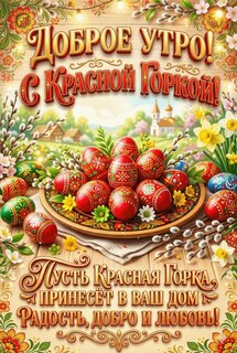 Праздничная открытка с поздравлением «Доброе утро! С Красной Горкой!». На изображении представлена красивая композиция с расписными пасхальными яйцами на тарелке, веточками вербы, нежными цветами и уютным загородным пейзажем с церквью на фоне. В нижней части открытки расположено теплое пожелание: «Пусть Красная Горка принесёт в ваш дом радость, добро и любовь!». Яркое, солнечное и жизнерадостное изображение, идеально подходящее для отправки близким и друзьям в мессенджерах или социальных сетях в день праздника Красная Горка.