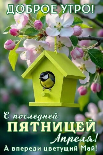 Открытка "ДОБРОЕ УТРО! С ПОСЛЕДНЕЙ ПЯТНИЦЕЙ АПРЕЛЯ! А ВПЕРЕДИ ЦВЕТУЩИЙ МАЙ!"