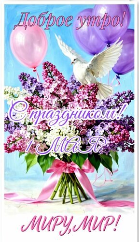 Красивая праздничная открытка к 1 Мая (Дню весеннего и летнего солнцестояния / Празднику весны и труда). На изображении пышный букет сирени розовых и фиолетовых оттенков, украшенный розовой лентой. Над цветами парит белый голубь — символ мира, а рядом парят нежные воздушные шары (розовый и фиолетовые). На картинке расположены поздравительные надписи на русском языке: «Доброе утро!», «С праздником! 1 Мая» и лозунг «Миру, мир!». Яркая, весенняя и оптимистичная открытка для поздравлений в мессенджерах и социальных сетях.