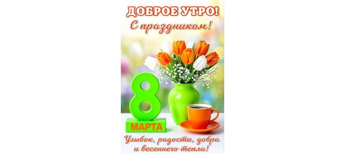 Открытка "ДОБРОЕ УТРО! С ПРАЗДНИКОМ! 8 МАРТА. УЛЫБОК, РАДОСТИ, ДОБРА И ВЕСЕННЕГО ТЕПЛА!"