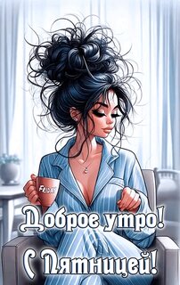 Цифровая иллюстрация в стиле аниме/комикса, изображающая молодую привлекательную девушку с пышным пучком темных волос. Девушка одета в голубую пижаму в полоску и сидит в уютной домашней обстановке, держа в руке чашку с надписью "FRIDAY". На изображении присутствует текст на русском языке: "Доброе утро! С Пятницей!". Картинка передает атмосферу уютного утра и предвкушения выходных, идеально подходит для поздравлений в социальных сетях и мессенджерах.