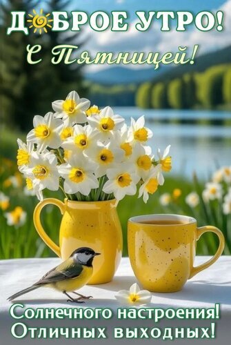 Красивая поздравительная открытка к пятнице с пожеланиями солнечного настроения и отличных выходных. На изображении представлен пышный букет белых нарциссов с желтой сердцевиной в желтой вазе, стоящей рядом с чашкой теплого напитка. На переднем плане на скатерти сидит маленькая яркая птичка. Фон наполнен летней природой: спокойным озером и зелеными лесами под мягким утренним светом. Идеально подходит для отправки друзьям и близким в мессенджерах для поднятия настроения.