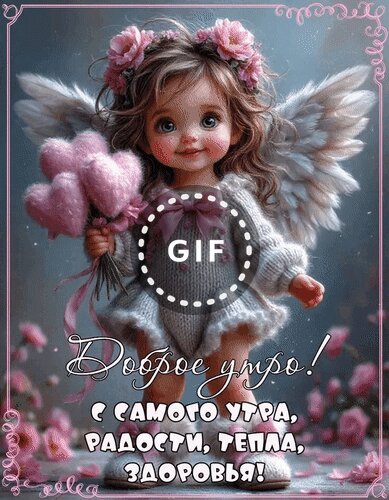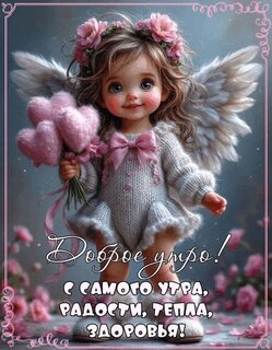 Милая и очаровательная цифровая иллюстрация с изображением маленького ангелочка. Девочка-ангел с пушистыми крыльями, в розовом платье и с венком из цветов на голове держит букет розовых сердец. Изображение выполнено в нежных пастельных тонах и наполнено теплом. Внизу расположена поздравительная надпись на русском языке: "Доброе утро! С самого утра, радости, тепла, здоровья!". Идеально подходит для отправки в мессенджерах и социальных сетях в качестве доброго пожелания на утро.