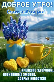 Красивая поздравительная открытка с пожеланием доброго утра. На изображении представлен нежный букет синих мускари в голубой вазе с желтым бантом, чашка теплого напитка и два вязаных желтых сердечка на фоне спокойного озера и гор. Картинка наполнена весенним настроением, солнечным светом и уютом. Текст на русском языке: «ДОБРОЕ УТРО! Счастливого дня! Крепкого здоровья, позитивных эмоций, добрых новостей!» Идеально подходит для отправки в мессенджерах и социальных сетях для поднятия настроения близким и друзьям.