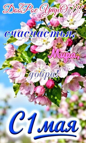Красочная поздравительная открытка к 1 мая. На фоне весеннего голубого неба изображена пышная ветка цветущей яблони с розовыми и белыми цветами. На картинке нанесен праздничный текст на русском языке: «Доброе Утро!!! счастья, Мира, добра! С 1 мая». Идеально подходит для отправки в мессенджерах и социальных сетях для пожелания хорошего настроения и весеннего тепла в Праздник Весны и Труда.