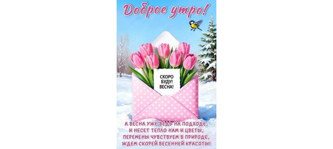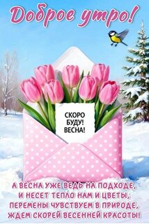 Открытка "ДОБРОЕ УТРО! СКОРО БУДУ!ВЕСНА! А ВЕСНА УЖЕ ВЕДЬ НА ПОДХОДЕ, И НЕСЕТ ТЕПЛО НАМ И ЦВЕТЫ, ПЕРЕМЕНЫ ЧУВС"