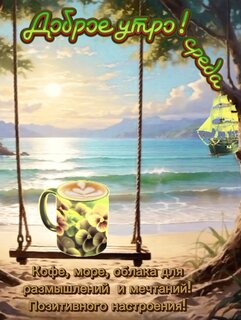Красивая поздравительная открытка с пожеланием доброго утра. На изображении представлен безмятежный морской пейзаж с пляжем, солнечным светом и облаками. На переднем плане на качелях висит чашка кофе с цветочным узором, а в море плывет парусник. Текст на русском языке гласит: «Доброе утро! Среда. Кофе, море, облака для размышлений и мечтаний! Позитивного настроения!» Идеально подходит для отправки друзьям и близким в мессенджерах для создания утреннего настроения и вдохновения.