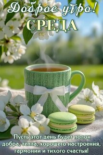 Красивая открытка с пожеланием доброго утра в среду. На изображении уютная композиция: чашка нежно-зеленого чая, украшенная белым бантом, и два аппетитных макаруна на фоне цветущих белых садов. В верхней части надпись «Доброе утро! СРЕДА», а внизу вдохновляющее пожелание: «Пусть этот день будет полон добра, тепла, хорошего настроения, гармонии и тихого счастья!». Идеально подходит для отправки друзьям и близким в мессенджерах и социальных сетях для создания позитивного настроения в середине недели.
