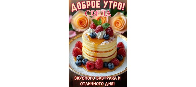Открытка "ДОБРОЕ УТРО! СРЕДА. ВКУСНОГО ЗАВТРАКА И ОТЛИЧНОГО ДНЯ!"