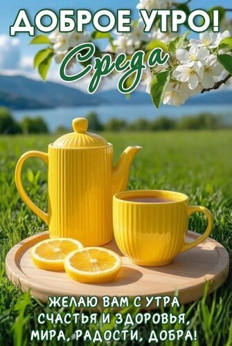 Красивая открытка с пожеланием доброго утра в среду. На изображении уютная композиция: желтый чайник и чашка с чаем на деревянной подставке, дольки лимона и цветущие ветви деревьев на фоне живописного летнего пейзажа с озером и горами. Текст на картинке: «ДОБРОЕ УТРО! Среда. Желаю вам с утра счастья и здоровья, мира, радости, добра!» Идеально подходит для отправки друзьям и близким в мессенджерах и социальных сетях для создания позитивного настроения в середине недели.