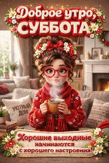 Красочная поздравительная открытка с надписью «Доброе утро, суббота!». На изображении милая девушка в красном свитере и очках с цветами в волосах наслаждается горячим кофе в уютной домашней обстановке. Внизу расположена надпись: «Хорошие выходные начинаются с хорошего настроения!». Теплая, праздничная атмосфера, мягкий свет, цветы и уютный интерьер. Идеально подходит для отправки друзьям и близким в мессенджерах и социальных сетях для создания позитивного настроя в субботнее утро.