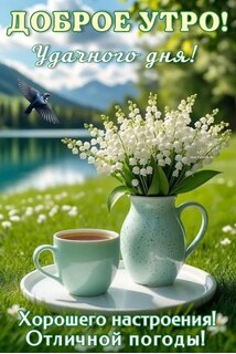Красивая и вдохновляющая открытка для доброго утра. На изображении запечатлен уютный натюрморт на фоне природы: чашка ароматного чая или кофе, изящная светлая ваза с нежными цветами ландыша, стоящая на траве. На заднем плане виден живописный пейзаж с озером, горами и лесом, а в небе парит птица. Текст на русском языке пожелания: «Доброе утро! Удачного дня! Хорошего настроения! Отличной погоды!». Идеально подходит для отправки друзьям и близким в мессенджерах и социальных сетях для создания позитивного настроя с самого утра.