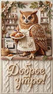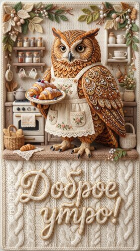 Теги:доброеутро вязаныйстиль сова уют рукоделие пэчворк цифровоеискусство digitalart иллюстрация открытка мастерскаяоткрыток 3deffect нейросеть необычныйстиль круассаны теплота