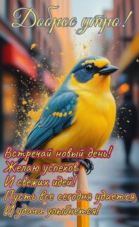 Красивая открытка с пожеланием доброго утра. На изображении крупным планом запечатлена яркая сине-желтая птичка, сидящая на ветке на фоне размытого городского пейзажа. На картинке наложен праздничный текст на русском языке: «Доброе утро! Встречай новый день! Желаю успехов и свежих идей! Пусть все сегодня удается, и удача улыбнется!». Идеально подходит для отправки в мессенджерах (WhatsApp, Telegram) и социальных сетях в качестве утреннего приветствия для друзей и близких.