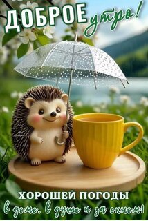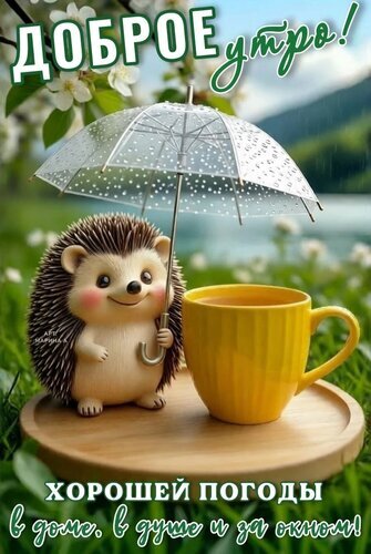 Милая и уютная открытка с изображением маленького ежика, который держит прозрачный зонтик рядом с большой желтой кружкой чая или кофе. На фоне — живописный весенний пейзаж с цветами сакуры, водой и горами. На картинке расположены поздравительные надписи на русском языке: «Доброе утро!» сверху и пожелание «Хорошей погоды в доме, в душе и за окном!» снизу. Идеально подходит для отправки близким в мессенджерах (WhatsApp, Viber) для создания позитивного настроения с утра.