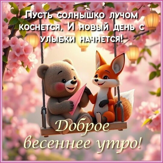 Милая поздравительная открытка к весеннему утру с изображением очаровательных мультяшных медвежонка и лисички, сидящих на качелях среди цветущей сакуры. На картинке размещен вдохновляющий текст на русском языке: «Пусть солнышко лучом коснется, и новый день с улыбки начнется! Доброе весеннее утро!». Изображение наполнено нежностью, теплыми розовыми тонами и весенним настроением, идеально подходит для отправки друзьям и близким в мессенджерах или социальных сетях для пожелания хорошего начала дня.