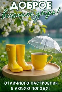 Красочная открытка с весенним настроением. На переднем плане на деревянном подносе стоят ярко-желтые резиновые сапоги и чашка горячего напитка, защищенная маленьким прозрачным зонтиком. Фон представляет собой живописный весенний пейзаж с цветущей белой вишней, зеленой травой и спокойным озером. В верхней части надпись «ДОБРОЕ весеннее утро!», а внизу — «ОТЛИЧНОГО НАСТРОЕНИЯ В ЛЮБУЮ ПОГОДУ!». Идеальное изображение для пожелания доброго утра и позитивного настроя в дождливую весеннюю погоду.