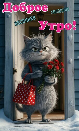 На этой милой и забавной картинке изображен пушистый серый кот, который стоит в дверном проеме и держит букет ярко-красных роз. Кот одет в уютный свитер и несет красную сумку в белый горошек, создавая образ спешащего на свидание или в гости персонажа. На фоне виден заснеженный порог, что подчеркивает прохладную погоду. Сверху расположена надпись на русском языке: "Доброе холодное весеннее утро!", что делает это изображение идеальной поздравительной открыткой для мессенджеров и социальных сетей. Изображение выполнено в стиле 3D-анимации с детальной прорисовкой шерсти и эмоций кота.