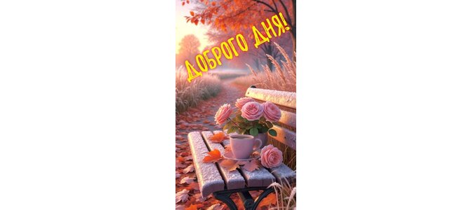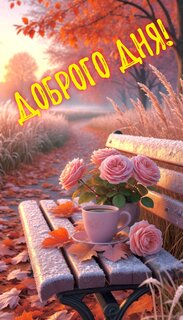 На скамейке покрытой инеем стоят чашка с горячим кофе и букет роз Надпись на открытке "Доброго дня!"