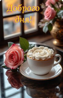 На столике перед окном стоит чашечка с кофе, лежит розочка. Доброго дня!