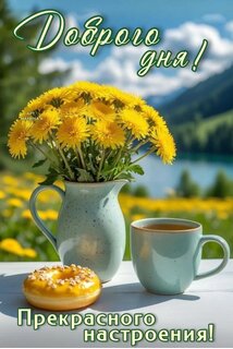 Красивая поздравительная открытка с пожеланием доброго дня. На изображении представлен букет ярких желтых одуванчиков в светлой керамической вазе, чашка горячего напитка и аппетитный пончик с глазурью на столе. Фон наполнен солнечным светом, зеленью и видом на спокойное озеро и горы. Надпись на русском языке: «Доброго дня! Прекрасного настроения!». Идеально подходит для отправки друзьям и близким в мессенджерах и социальных сетях для создания позитивного настроя с самого утра.