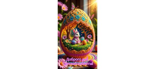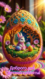 Красочное и уютное изображение к Пасхе, выполненное в стиле реалистичной вязаной игрушки. В центре композиции — декоративное пасхальное яйцо, внутри которого, словно в миниатюрном саду, расположился милый белый кролик. Вокруг кролика — зелёная травка, маленькие цветы и другие пасхальные яйца. Вся сцена пронизана солнечным светом, а сверху приземлилась яркая бабочка. Теплые оттенки розового, желтого и голубого создают атмосферу праздника и весеннего тепла. В нижней части изображения расположена надпись на русском языке: «Доброго дня Светлой субботы!». Идеально подходит для поздравительных открыток и праздничного настроения.
