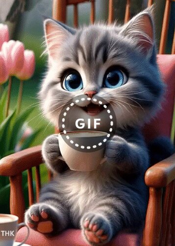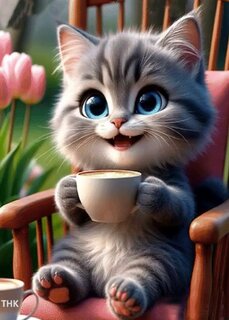 Милое и очаровательное изображение пушистого серого котенка с большими голубыми глазами, который сидит в уютном кресле и держит маленькую чашку кофе. Котенок выглядит очень счастливым и улыбающимся. На заднем плане видны нежные розовые тюльпаны, создающие атмосферу весеннего утра и домашнего уюта. Высококачественная цифровая иллюстрация в стиле гиперреалистичной 3D-анимации, идеально подходящая для создания позитивного настроения.