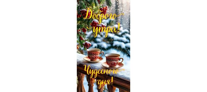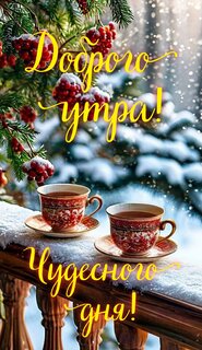 В заснеженном саду, на перилах трассы стоят две красивые чашки с горячим кофе