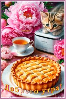 Теги:тарелка с пирогом, чашечка чая, блюдце, котёнок, пионы, 3d текст