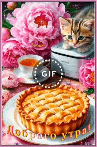Красивая и уютная открытка для доброго утра с изображением аппетитного домашнего пирога, чашки ароматного чая и нежных розовых пионов. На картинке также запечатлен милый маленький котенок, выглядывающий из-за чашки, что создает атмосферу тепла, уюта и радости. Идеально подходит для отправки близким, друзьям и любимым в качестве пожелания хорошего начала дня. Эстетичная композиция в розовых тонах с надписью «Доброго утра!» на русском языке.