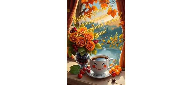 За окном осенний пейзаж, а на подоконнике стоит чашечка с кофе и ваза с букетом роз