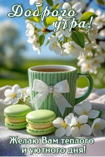 Красивая открытка с пожеланием доброго утра. На нежном фоне цветущих весенних деревьев изображена уютная зеленая кружка с белым бантом, дополненная аппетитными зелеными пирожными макарон и белоснежными цветами. В верхней части надпись «Доброго утра!», а в нижней — «Желаю Вам теплого и уютного дня!». Идеальная картинка для отправки друзьям и близким в мессенджерах, чтобы создать весеннее и позитивное настроение с самого начала дня.