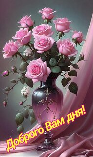 В вазе стоит прекрасный букет роз. Надпись на открытке "Доброго вам дня!"