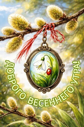 Весенняя поздравительная открытка с нежным настроением. На изображении представлен изящный медальон в золотистой оправе, внутри которого изображен белый первоцвет (подснежник) и яркая божья коровка на фоне зелени. Композиция обрамлена пушистыми ветками вербы с мягким освещением. Крупный текст на русском языке гласит: "ДОБРОГО ВЕСЕННЕГО УТРА!". Идеально подходит для отправки в мессенджерах и социальных сетях для создания праздничного весеннего настроения.