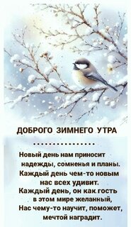 Доброго зимнего утра. Новый день нам приносит надежды, сомненья и планы. Каждый день чем-то новым нас всех удивит. Каждый день, он как гость в этом мире желанный, нас чему-то научит, поможет, мечтой наградит.