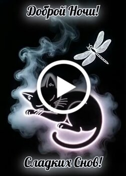 Красивое и спокойное видео для пожелания доброй ночи. На темном фоне изображен спящий кот, выполненный в виде светящегося силуэта, окруженного мягкими клубами дыма или тумана. Рядом с котом парит изящная стрекоза. Сверху расположена надпись Доброй Ночи, а снизу Сладких Снов. Видео наполнено атмосферой уюта, тишины и спокойствия, что делает его идеальным для отправки близким перед сном.