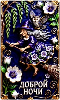 Яркая и сказочная декоративная открытка с изображением доброй ведьмочки на метле. Композиция выполнена в насыщенных синих и фиолетовых тонах с золотистой отделкой. На фоне глубокого ночного неба видны мудрая сова, изящные цветы и ветви ивы. В нижней части кадра расположена красивая надпись на русском языке «ДОБРОЙ НОЧИ». Изображение обладает эффектом объема (3D), создавая ощущение волшебства и уюта. Идеально подходит для пожеланий спокойной ночи в сказочном стиле.