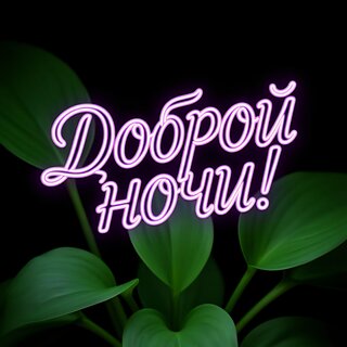 Эстетичное изображение с неоновой надписью «Доброй ночи!» на русском языке. Светящиеся розовые буквы выполнены в изящном рукописном стиле и эффектно контрастируют с темным фоном. На переднем и заднем плане видны сочные зеленые листья тропического растения, создающие атмосферу уюта, спокойствия и ночной свежести. Идеально подходит для использования в качестве тематической заставки, поздравительной открытки или декоративного фона для пожеланий спокойной ночи.
