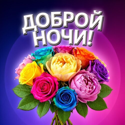 Красочный и яркий букет разноцветных роз на насыщенном розово-фиолетовом фоне с крупной надписью «ДОБРОЙ НОЧИ!». Изображение включает в себя розы всех цветов радуги: желтые, розовые, синие, оранжевые и фиолетовые. Идеально подходит для отправки в качестве поздравительной открытки, пожелания спокойной ночи близким, друзьям или любимым в мессенджерах и социальных сетях. Яркая, эмоциональная и позитивная картинка для создания приятного настроения перед сном.