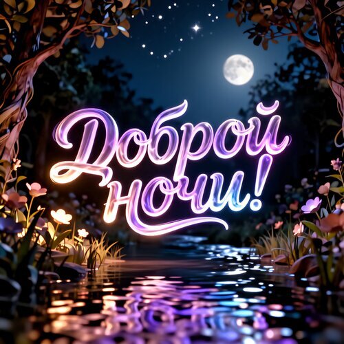 Магическая и уютная цифровая иллюстрация с надписью «Доброй ночи!» на русском языке. Композиция представляет собой сказочный ночной пейзаж: в центре расположена объемная, светящаяся каллиграфическая надпись в розово-фиолетовых тонах. Фон украшен густым лесом, светящимися цветами, спокойной рекой с бликами лунного света и яркой полной луной на звездном небе. Изображение выполнено в стиле фэнтези с мягким неоновым освещением, создавая атмосферу спокойствия, волшебства и безмятежности. Идеально подходит для поздравительных открыток, сторис и пожеланий спокойной ночи.