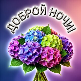 Красивая и яркая открытка с надписью «ДОБРОЙ НОЧИ!» на фоне пышного букета разноцветных гортензий. В композиции использованы насыщенные оттенки фиолетового, синего, розового и салатового цветов. Цветы расположены крупным планом, создавая объемный и праздничный эффект. Мягкое свечение и градиентный фон делают изображение идеальным для отправки в мессенджерах и социальных сетях в качестве пожелания спокойной ночи близким и друзьям.